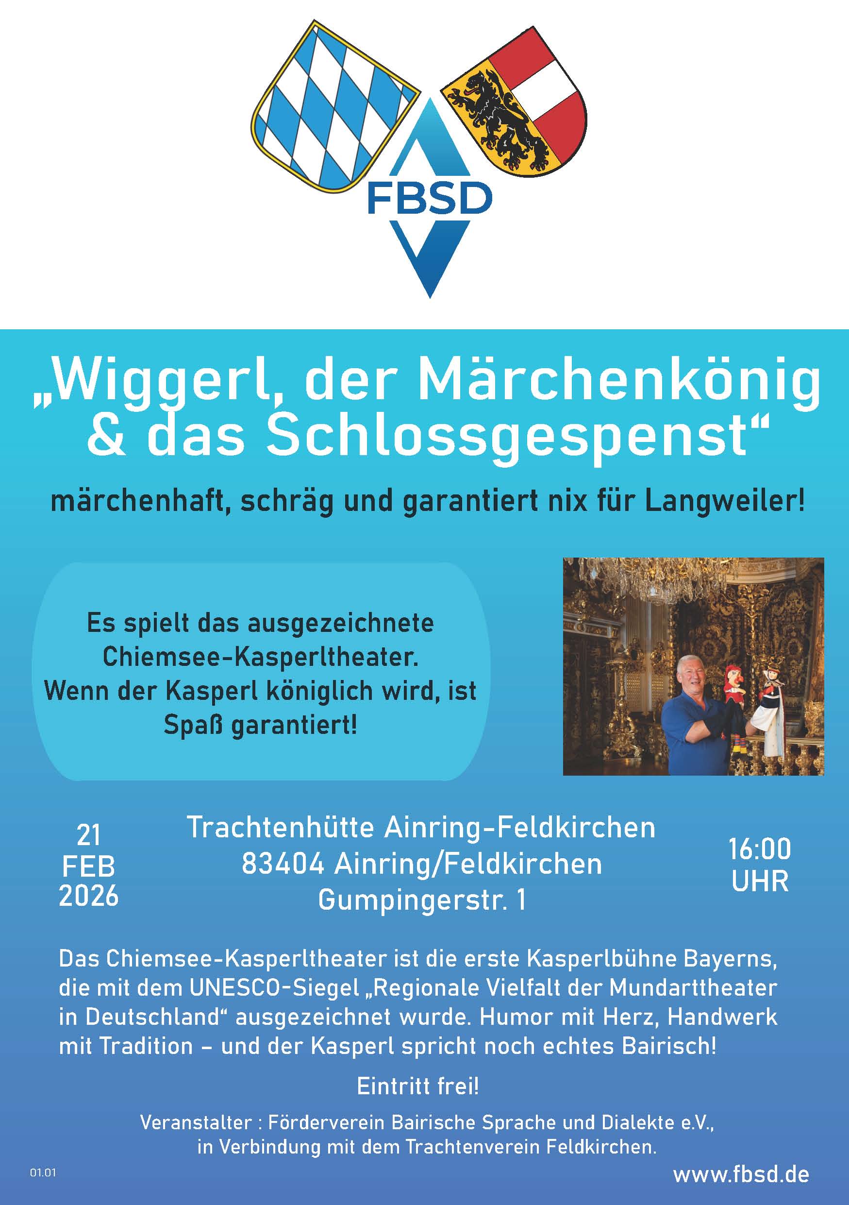 Wir freuen uns über den Besuch des Chiemsee-Kasperltheaters in unserer Trachtenhütte. Am 21. Februar um 16 Uhr laden wir alle Interessierten ein zum Stück "Wiggerl, der Märchenkönig und das Schlossgespenst." - märchenhaft, schräg und garantiert nichts für Langweiler!