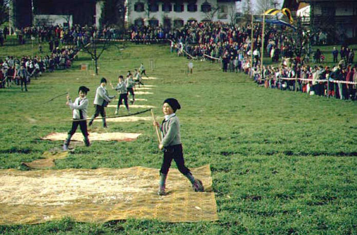 Auf die Bräuche im kirchlichen Jahreskreis wird wieder sehr viel Wert. gelegt. So wurde Eltern und Kindern gezeigt, wie ein Palmbesen gebunden wird. Sowohl Osterkerzen basteln als auch das „Oascheiben" an den Ostertagen sind erhaltenswerte Überlieferungen, die den Trachtenkindern vermittelt werden.